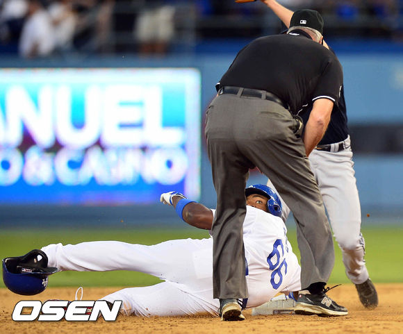 7일 (이하 한국시간) 미국 캘리포니아주 로스앤젤레스 다저스타디움에서 열린 2013 메이저리그 LA 다저스와 애틀랜타 브레이브스의 디비전시리즈 3차전 경기,3회말 1사 1루, 내야안타를 날린 다저스 푸이그가 애틀랜타 송구실책을 틈타 2루에 세이프되고 있다.