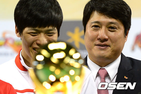 서울 SK 김선형과 문경은 감독이 포토타임을 하며 트로피를 바라보고 있다.