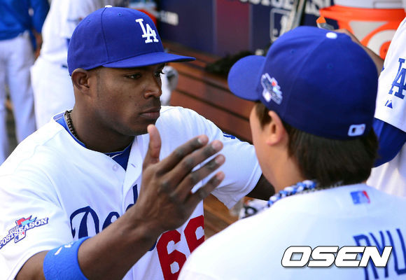 7일 (이하 한국시간) 미국 캘리포니아주 로스앤젤레스 다저스타디움에서 열린 2013 메이저리그 LA 다저스와 애틀랜타 브레이브스의 디비전시리즈 3차전 경기에 앞서 다저스 푸이그가 류현진과 포옹하고 있다.
