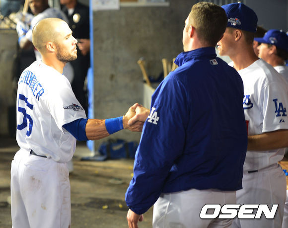 7일 (이하 한국시간) 미국 캘리포니아주 로스앤젤레스 다저스타디움에서 열린 2013 메이저리그 LA 다저스와 애틀랜타 브레이브스의 디비전시리즈 3차전 경기, 6회를 마치고 덕아웃으로 들어온 카푸아노가 덕아웃에서 슈마커와 하이파이브를 하고 있다.
