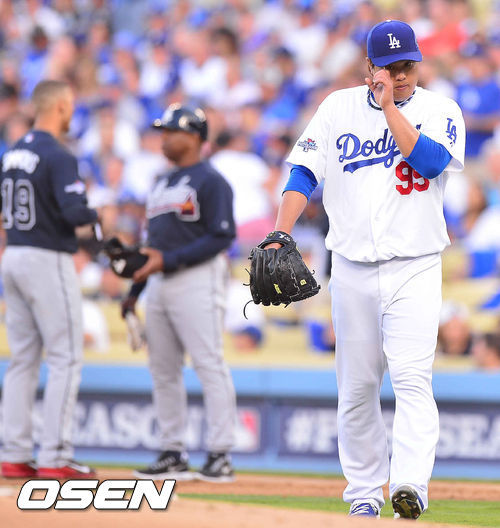 류현진은 7일(이하 한국시간) 다저스타디움에서 열린 애틀랜타 브레이브스와의 내셔널리그 디비전시리즈 3차전에 선발 등판해 큰 기대를 모았으나 3이닝 동안 6피안타 1볼넷 1탈삼진 4실점으로 부진한 뒤 강판됐다. 1회 2실점하며 다시 한 번 ‘1회 징크스’에 시달린 류현진은 3회 결정적인 수비 실책성 플레이가 2개 겹치며 또 다시 2실점했다. 갈 길이 바쁜 다저스는 류현진의 조기강판이라는 승부수를 던졌다.