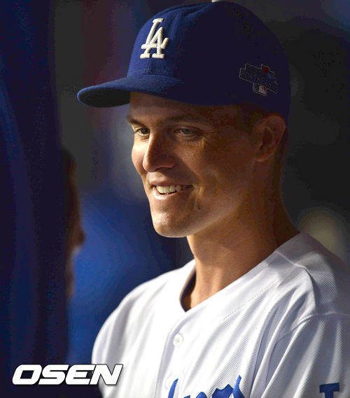 7일 (이하 한국시간) 미국 캘리포니아주 로스앤젤레스 다저스타디움에서 열린 2013 메이저리그 LA 다저스와 애틀랜타 브레이브스의 디비전시리즈 3차전 경기,다저스의 승기가 확실해지자 다저스 잭 그레인키가 미소 짓고 있다.