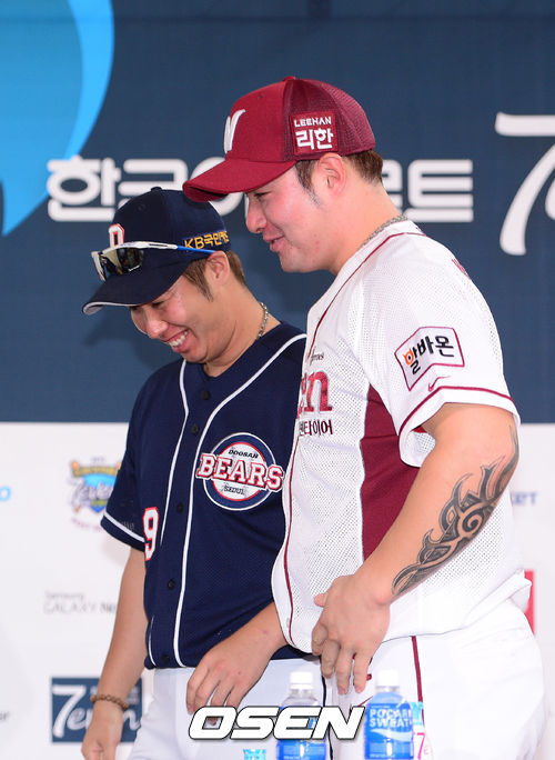 7일 오후 서울 목동구장에서 진행된 '2013 한국야쿠르트 세븐 프로야구 준플레이오프 미디어데이' 행사를 마친 두산 유희관, 넥센 박병호가 미소를 지으며 기자회견장을 나서고 있다.