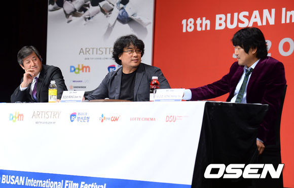 7일 오후 부산 신세계센텀시티 문화홀에서 진행된 '설국열차'(봉준호 감독) 갈라프리젠테이션 기자회견에서 이용관 집행위원장과 봉준호 감독이 송강호를 바라보고 있다.