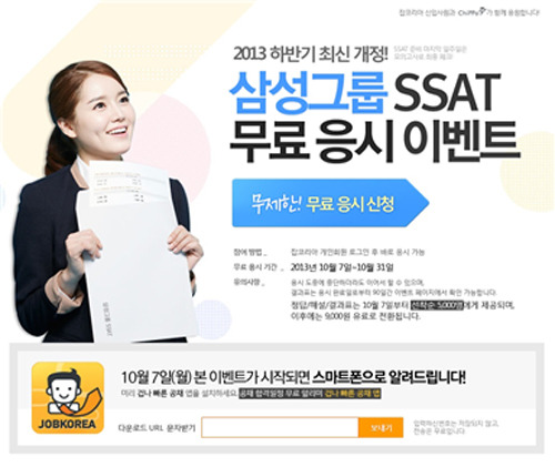 이벤트 내용은 삼성그룹 SSAT 직무적성검사를 무제한으로 응시할 수 있는 것으로, 잡코리아 개인회원이라면 누구나 참여 가능하다. 많은 사이트에서 제공하는 삼성그룹 SSAT 모의시험과 달리 2013년 하반기 삼성 SSAT용 최신 개정판을 제공하는 것이 특징이다.