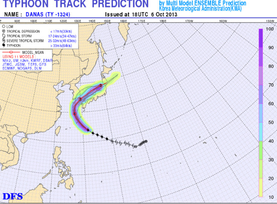 기상청 발표에 따르면 태풍 다나스 예상경로는 8일 오전 3시 일본 오키나와 북쪽 약 400km 부근 해상을 통과한 뒤 이날 오후 3시 서귀포 남동쪽 약 150km 부근 해상까지 북상해 우리나라 남부행안 일대를 영향권에 둘 것으로 보인다.