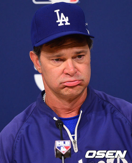 8일 (이하 한국시간) 미국 캘리포니아주 로스앤젤레스 다저스타디움에서 2013 메이저리그 LA 다저스와 애틀랜타 브레이브스의 디비전시리즈 4차전 경기가 열릴 예정인 가운데 경기 전 돈 매팅리 감독이 기자회견을 하며 한숨을 내쉬고 있다.