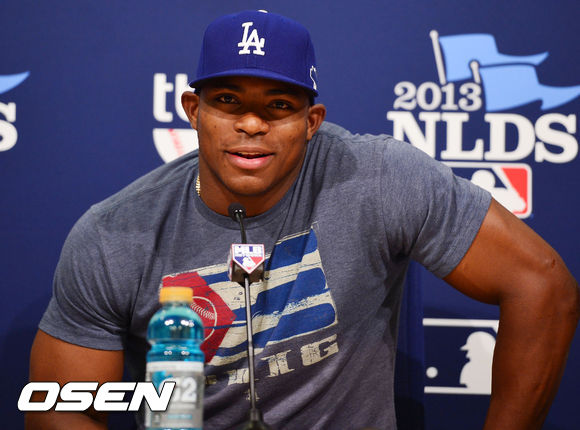 8일 (이하 한국시간) 미국 캘리포니아주 로스앤젤레스 다저스타디움에서 2013 메이저리그 LA 다저스와 애틀랜타 브레이브스의 디비전시리즈 4차전 경기가 열릴 예정인 가운데 경기 전 다저스 야시엘 푸이그가 기자회견을 하고 있다.