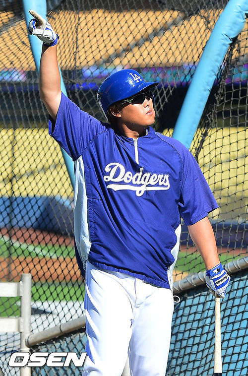 8일 (이하 한국시간) 미국 캘리포니아주 로스앤젤레스 다저스타디움에서 2013 메이저리그 LA 다저스와 애틀랜타 브레이브스의 디비전시리즈 4차전 경기가 열릴 예정인 가운데 류현진이 타격 훈련 중 연속해서 홈런을 날린 후 사인을 보내고 있다.