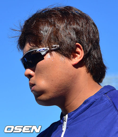 8일 (이하 한국시간) 미국 캘리포니아주 로스앤젤레스 다저스타디움에서 2013 메이저리그 LA 다저스와 애틀랜타 브레이브스의 디비전시리즈 4차전 경기가 열릴 예정인 가운데 류현진이 타격 훈련을 마친 후 구슬땀을 흘리며 덕아웃으로 향하고 있다.