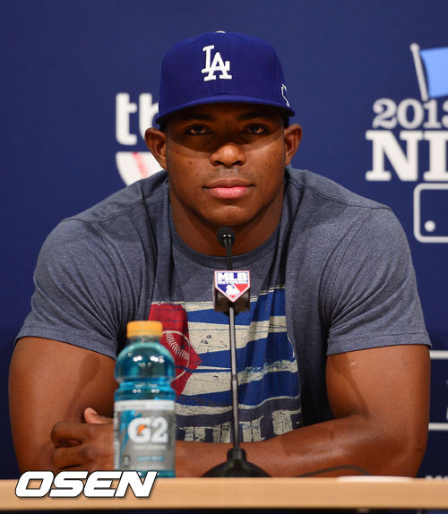 8일 (이하 한국시간) 미국 캘리포니아주 로스앤젤레스 다저스타디움에서 열린 2013 메이저리그 LA 다저스와 애틀랜타 브레이브스의 디비전시리즈 4차전 경기, 경기 전 야시엘 푸이그가 인터뷰를 하고 있다.