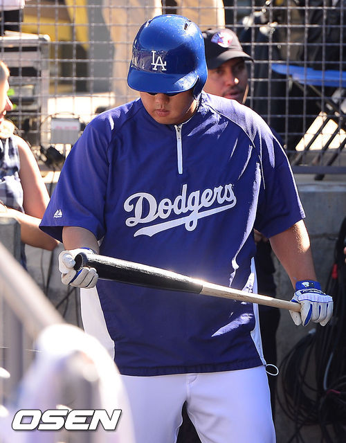8일 (이하 한국시간) 미국 캘리포니아주 로스앤젤레스 다저스타디움에서 2013 메이저리그 LA 다저스와 애틀랜타 브레이브스의 디비전시리즈 4차전 경기가 열릴 예정인 가운데 다저스 류현진이 배트를 고르고 있다.