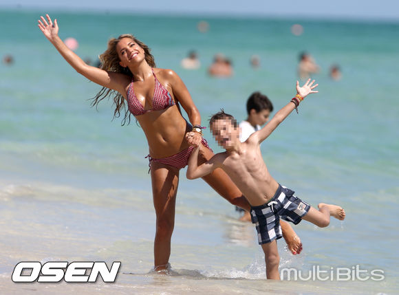 [OSEN/WENN 특약]7일(현지시간) 네덜란드 출신의 모델 겸 배우 실비 판데르 파르트가 미국 마이애미 비치에서 아들과 함께 휴가를 즐기는 모습이 포착되었다.
