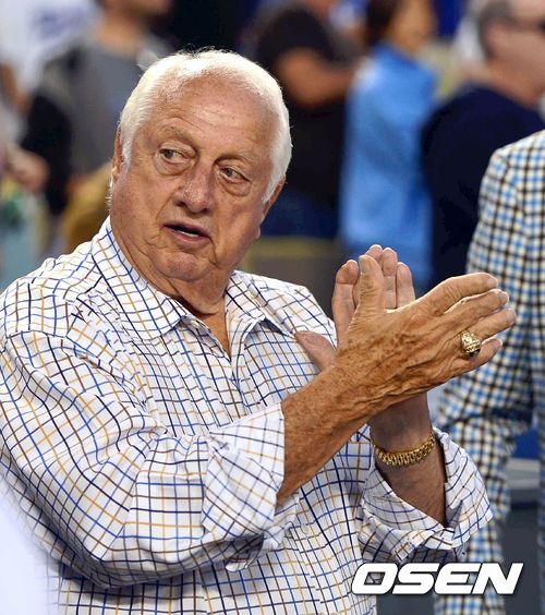 8일 (이하 한국시간) 미국 캘리포니아주 로스앤젤레스 다저스타디움에서 2013 메이저리그 LA 다저스와 애틀랜타 브레이브스의 디비전시리즈 4차전 경기 4일만에 등판하는 커쇼가 등판하자 토미 라소다가 박수를 치고 있다.