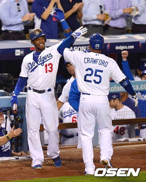 8일 (이하 한국시간) 미국 캘리포니아주 로스앤젤레스 다저스타디움에서 2013 메이저리그 LA 다저스와 애틀랜타 브레이브스의 디비전시리즈 4차전 경기 3회말 1사 크로포드가 1회에 이어 연타석 솔로홈런을 치고 라미레즈와 하이파이브를 하고 있다.