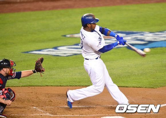 8일 (이하 한국시간) 미국 캘리포니아주 로스앤젤레스 다저스타디움에서 2013 메이저리그 LA 다저스와 애틀랜타 브레이브스의 디비전시리즈 4차전 경기 1회말 라미레즈가 안타를 치고 있다.