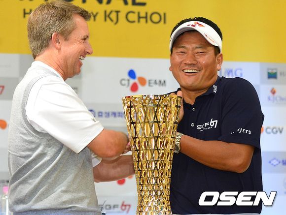 최경주와 데이비드 톰스가 우승트로피와 함께 포토타임을 갖던 중 장난을 치고 있다.