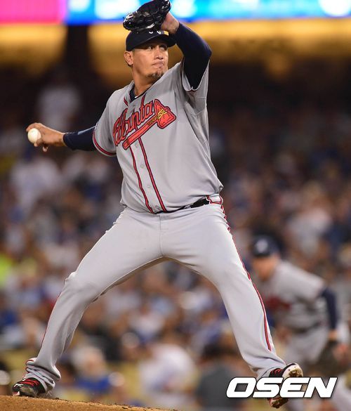 8일 (이하 한국시간) 미국 캘리포니아주 로스앤젤레스 다저스타디움에서 2013 메이저리그 LA 다저스와 애틀랜타 브레이브스의 디비전시리즈 4차전 경기 애틀랜타 선발 투수 가르시아가 힘차게 공을 던지고 있다.