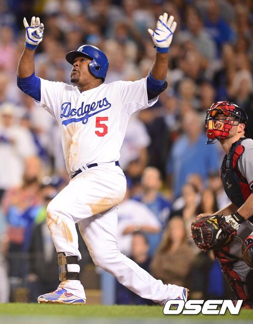 8일 (이하 한국시간) 미국 캘리포니아주 로스앤젤레스 다저스타디움에서 2013 메이저리그 LA 다저스와 애틀랜타 브레이브스의 디비전시리즈 4차전 경기 8회말 무사 2루 유리베가 역전 투런 홈런을 치고 있다.