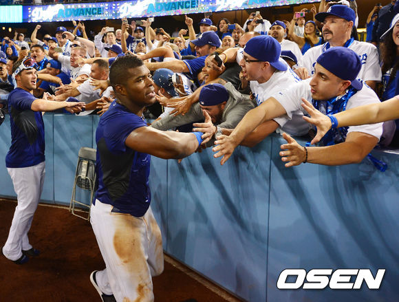 경기를 마치고 야시엘 푸이그가 팬들과 하이파이브를 하고 있다. / rumi@osen.co.kr