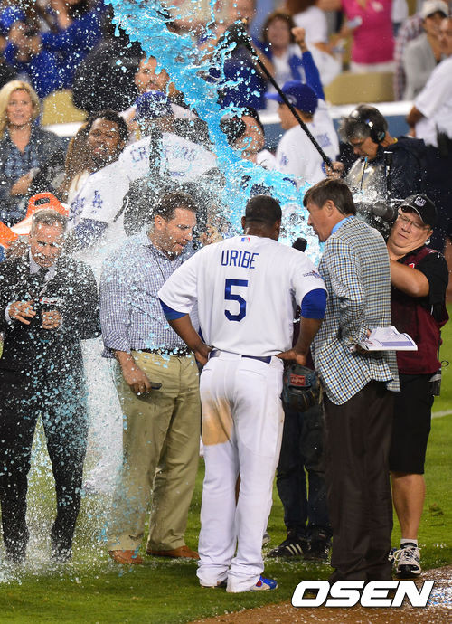 경기를 마치고 유리베가 물벼락을 맞고 있다. / rumi@osen.co.kr
