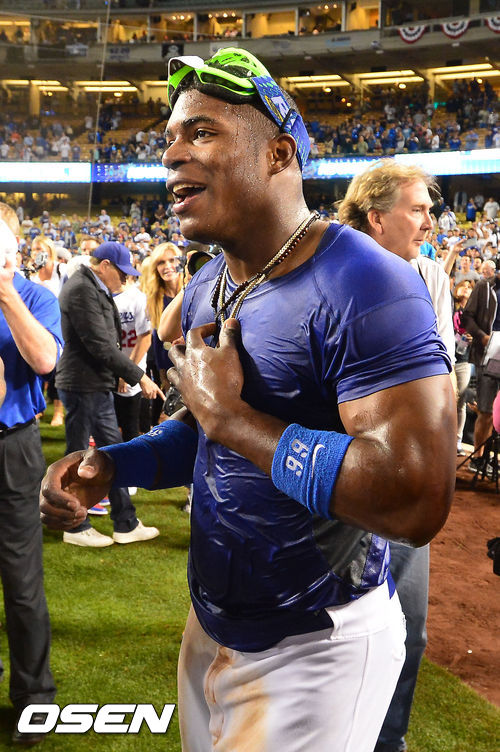 경기를 마치고 샴페인 세레를 맞은 푸이그가 기뻐하고 있다. / rumi@osen.co.kr