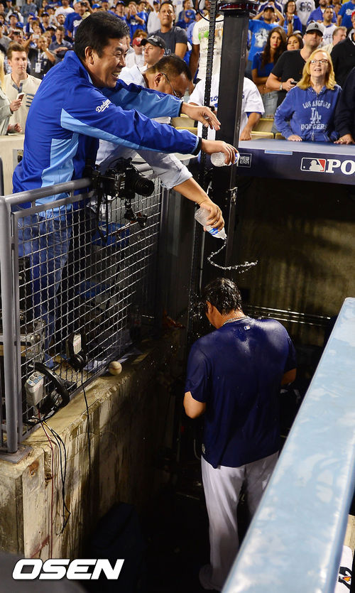 경기를 마치고 류현진 아버지 류재천씨가 류현진에게 물을 뿌리고 있다. / rumi@osen.co.kr