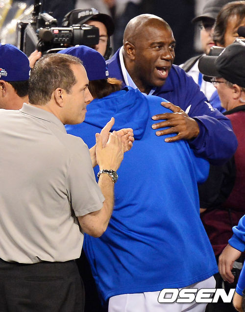 경기를 마치고 다저스 구단주 매직 존슨이 류현진과 포옹을 하고 있다./ rumi@osen.co.kr
