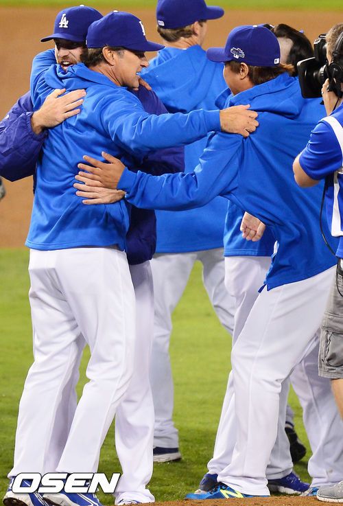경기를 마치고 돈 매팅리 감독이 류현진을 끌어당겨 포옹하고 있다./ rumi@osen.co.kr