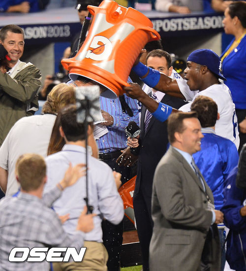 경기를 마치고 다저스 야시엘 푸이그가 곤잘레스의 머리에 음료수 통을 붓고 있다./ rumi@osen.co.kr