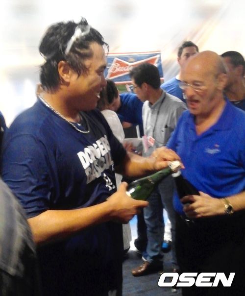 클럽하우스에서 벌어진 승리 세레모니에서 류현진이 샴페인을 따고 있다./ rumi@osen.co.kr