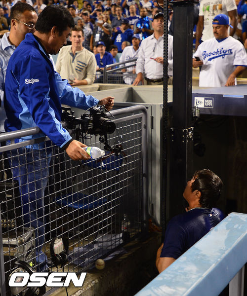 경기를 마치고 류현진 아버지 류재천씨가 류현진에게 물을 뿌린 후 얘기를 나누고 있다. /rumi@osen.co.kr