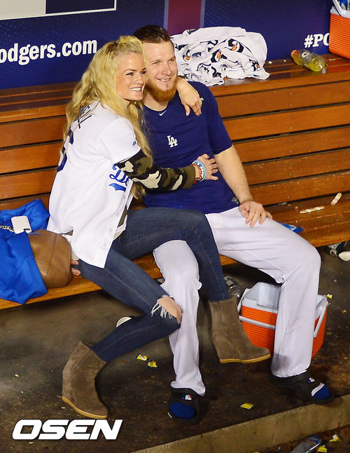 경기를 마치고 J.P 하웰이 아내와 함께 덕아웃에서 포즈를 취하고 있다. /rumi@osen.co.kr