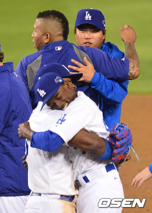 경기를 마치고 류현진이 벨리사리오와 포옹을 하고 있다. / rumi@osen.co.kr