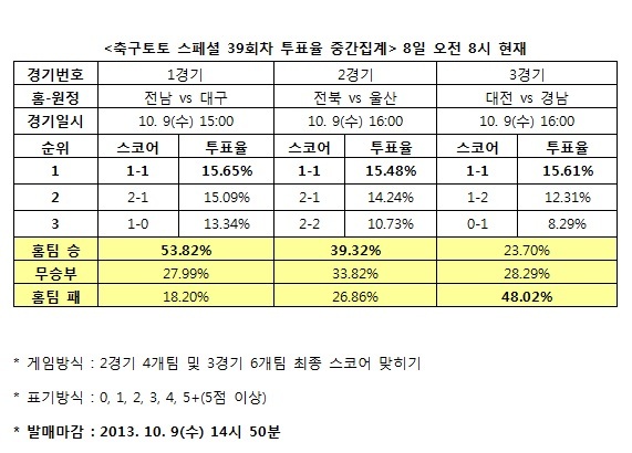 [축구토토] 국민체육진흥공단(www.kspo.or.kr)이 발행하는 체육진흥투표권 수탁사업자인 스포츠토토 공식 온라인 발매 사이트인 베트맨(www.betman.co.kr)은 오는 9일에 펼쳐지는 전남-대구(1경기), 전북-울산(2경기), 대전-경남(3경기)전 등 K리그 클래식 3경기를 대상으로 한 축구토토 스페셜 39회차 투표율 중간집계 결과, 축구팬 39.32%는 전북-울산(2경기)전에서 전북의 승리를 예상했다고 밝혔다.