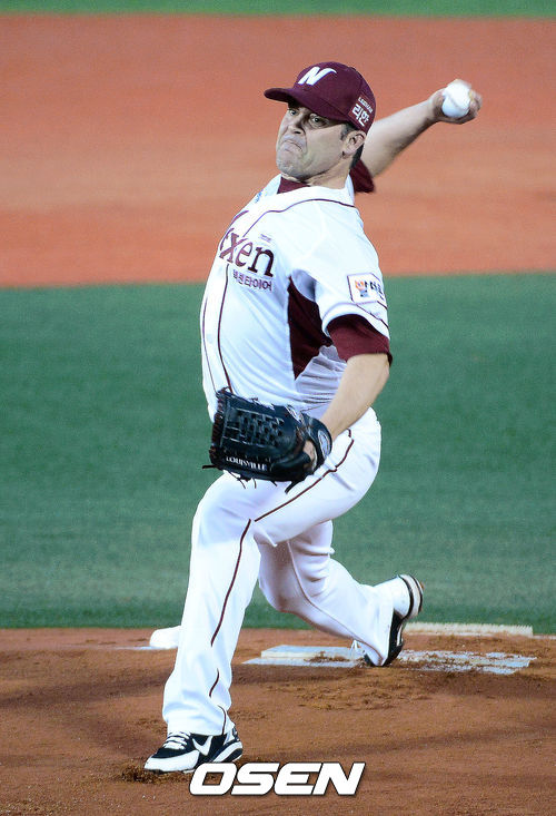 8일 오후 서울 목동구장에서 열린 '2013 한국야쿠르트 세븐 프로야구' 준플레이오프 1차전 넥센 히어로즈(3위)와 두산 베어즈(4위)의 경기, 넥센 선발 나이트가 공을 뿌리고 있다.