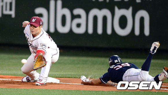 8일 오후 서울 목동구장에서 열린 '2013 한국야쿠르트 세븐 프로야구' 준플레이오프 1차전 넥센 히어로즈(3위)와 두산 베어즈(4위)의 경기, 1회초 무사 넥센 박병호가 유격수 앞 땅볼을 때린 뒤 1루에 헤드퍼 슬라이딩을 하는 두산 이종욱을 잡아내고 있다.