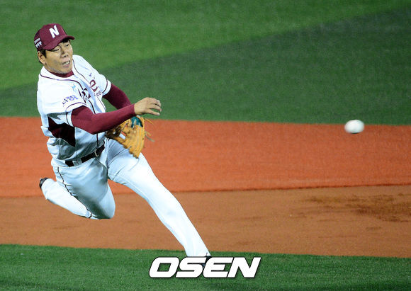 8일 오후 서울 목동구장에서 열린 '2013 한국야쿠르트 세븐 프로야구' 준플레이오프 1차전 넥센 히어로즈(3위)와 두산 베어즈(4위)의 경기, 1회초 선두타자 이종욱의 내야땅볼을 넥센 강정호 유격수가 아웃처리 시키고 있다.