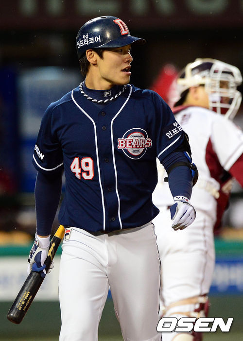 8일 오후 서울 목동구장에서 열린 '2013 한국야쿠르트 세븐 프로야구' 포스트시즌 넥센 히어로즈와 두산 베어스의 준플레이오프 1차전 경기 1회초 2사 민병헌이 삼진아웃을 당한 후 덕아웃으로 향하고 있다.