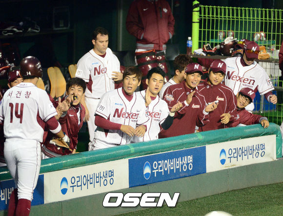 8일 오후 서울 목동구장에서 열린 '2013 한국야쿠르트 세븐 프로야구' 준플레이오프 1차전 넥센 히어로즈(3위)와 두산 베어즈(4위)의 경기, 1회말 무사 3루 서동욱 좌익수 희생플라이때 3루 주자 서건창 선취득점을 올리며 덕아웃 동료들의 환영을 받고 있다.