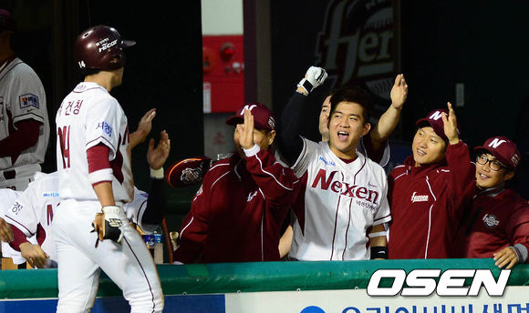8일 오후 서울 목동구장에서 열린 '2013 한국야쿠르트 세븐 프로야구' 포스트시즌 넥센 히어로즈와 두산 베어스의 준플레이오프 1차전 경기 1회말 무사 3루 서동욱의 희생플라이에 득점한 3루주자 서건창이 덕아웃에서 동료들과 하이파이브를 하고 있다.