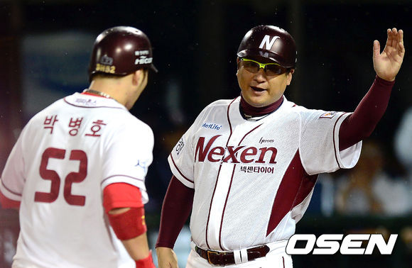 8일 오후 서울 목동구장에서 열린 '2013 한국야쿠르트 세븐 프로야구' 준플레이오프 1차전 넥센 히어로즈(3위)와 두산 베어즈(4위)의 경기, 1회말 2사 넥센 심재학 코치가 솔로 홈런을 때리고 홈으러 들어오는 박병호와 하이파이브를 하고 있다.