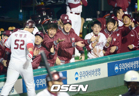8일 오후 서울 목동구장에서 열린 '2013 한국야쿠르트 세븐 프로야구' 준플레이오프 1차전 넥센 히어로즈(3위)와 두산 베어즈(4위)의 경기, 1회말 2사 박병호 중월솔로 홈런을 날리고 덕아웃 동료들의 환영을 받고 있다.