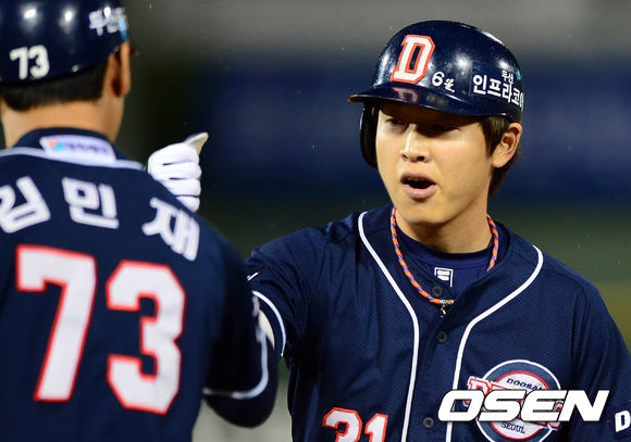 8일 오후 서울 목동구장에서 열린 '2013 한국야쿠르트 세븐 프로야구' 포스트시즌 넥센 히어로즈와 두산 베어스의 준플레이오프 1차전 경기 2회초 1사 1,3루 정수빈이 1타점 적시타를 치고 김민재 코치와 하이파이브를 하고 있다.