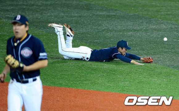 8일 오후 서울 목동구장에서 열린 '2013 한국야쿠르트 세븐 프로야구' 준플레이오프 1차전 넥센 히어로즈(3위)와 두산 베어즈(4위)의 경기, 3회말 선두타자 허도환의 내야안타때 두산 허경민 2루수가 다이빙캐치를 시도하였으나 안타를 허용하고 있다.