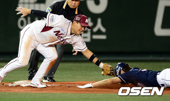 8일 오후 서울 목동구장에서 열린 '2013 한국야쿠르트 세븐 프로야구' 포스트시즌 넥센 히어로즈와 두산 베어스의 준플레이오프 1차전 경기 4회초 2사 2루 양의지 타석, 2루주자 정수빈이 도루에 실패하고 있다.