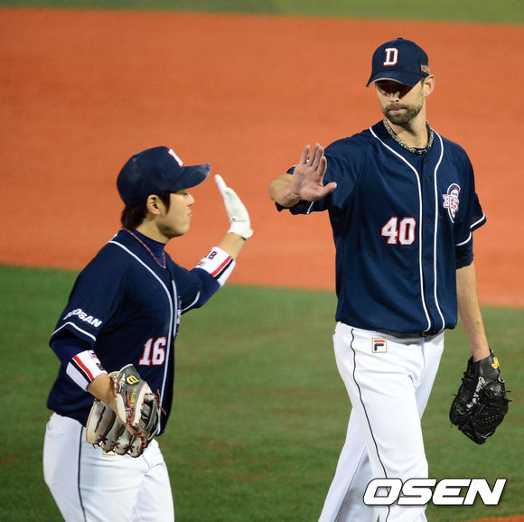 8일 오후 서울 목동구장에서 열린 '2013 한국야쿠르트 세븐 프로야구' 준플레이오프 1차전 넥센 히어로즈(3위)와 두산 베어즈(4위)의 경기, 4회말 1사 1루 문우람의 내야땅볼때 두산 선발 니퍼트 병살아웃 처리시키며 공수교대때 이원석의 환영을 받으며 덕아웃을 향하고 있다.