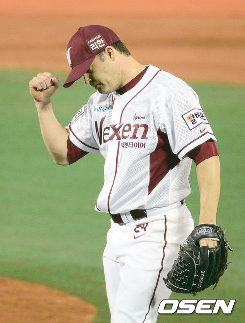 8일 오후 서울 목동구장에서 열린 '2013 한국야쿠르트 세븐 프로야구' 준플레이오프 1차전 넥센 히어로즈(3위)와 두산 베어즈(4위)의 경기, 6회초 2사 3루 넥센 선발 나이트가 홍성흔을 내야땅볼로 아웃처리 시키며 덕아웃을 향하고 있다.