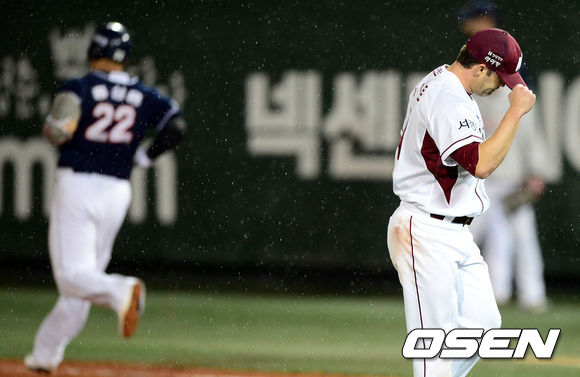 8일 오후 서울 목동구장에서 열린 '2013 한국야쿠르트 세븐 프로야구' 준플레이오프 1차전 넥센 히어로즈(3위)와 두산 베어즈(4위)의 경기, 6회초 2사 3루 넥센 나이트가 무실점으로 이닝을 막아내자 기뻐하고 있다.