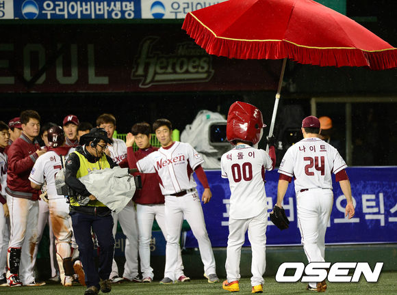8일 오후 서울 목동구장에서 열린 '2013 한국야쿠르트 세븐 프로야구' 포스트시즌 넥센 히어로즈와 두산 베어스의 준플레이오프 1차전 경기 6회초를 마치고 덕아웃으로 향하는 나이트에게 턱돌이가 대형 우산을 씌워주고 있다.